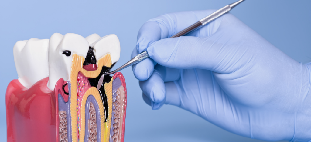 虫歯は初期の段階では痛みがほとんどなく、「少し黒い」「冷たい物がしみる程度」で済むことが多いため、つい放置してしまいがちです。しかし虫歯菌が神経まで到達すると、歯の内部は大きく破壊され、最終的には歯が欠けたり、根だけ残るような状態になります。
