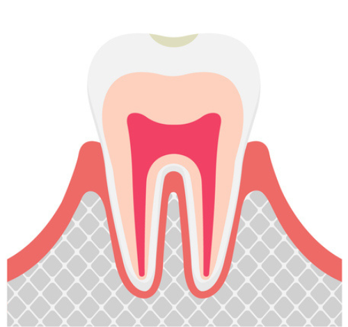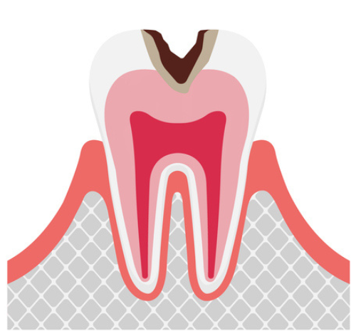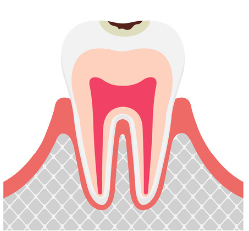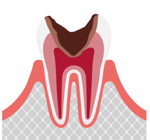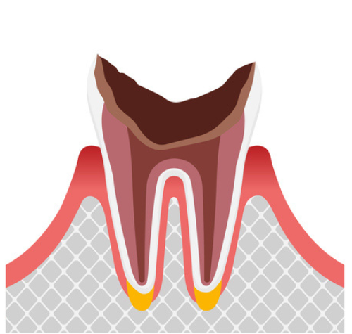 虫歯が象牙質の内側の歯髄に達したものです。この段階では、歯髄に細菌が進入し激しい痛みを伴うことがあります。歯髄の炎症が重度な場合は、歯髄組織を除去した後で、根管内を消毒し、シーリング材を用いて充填します。また、歯髄が死んでしまった歯はもろくなりますので、コアと呼ばれる柱を立てて、クラウンなどの被せ物をします。