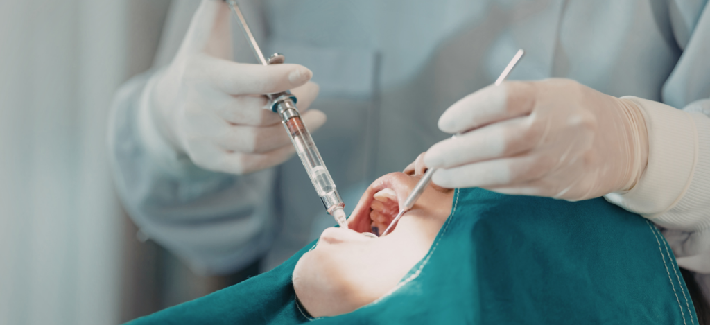 まず、麻酔の針を刺す前に“表面麻酔”を歯ぐきに塗布し、感覚をやわらげます。これにより、針を刺す瞬間の刺激を大きく軽減できます。